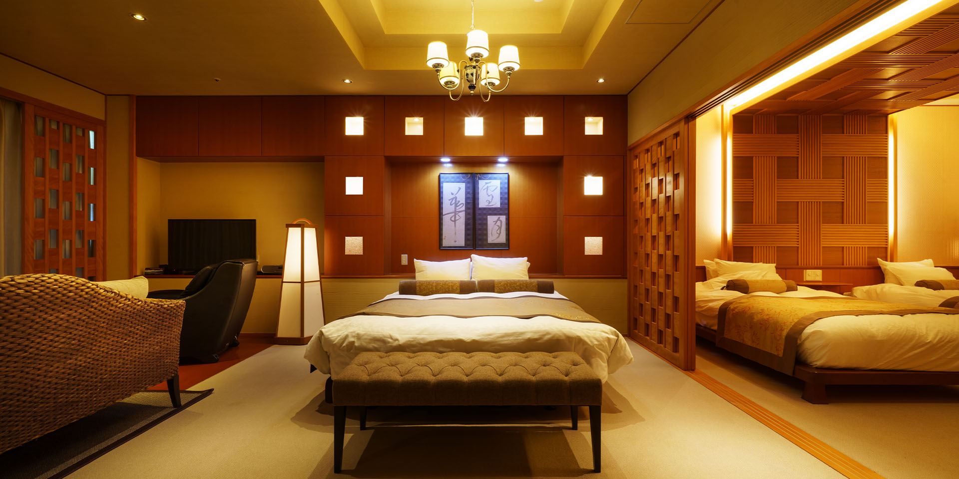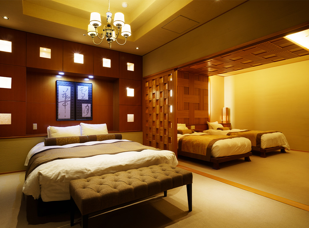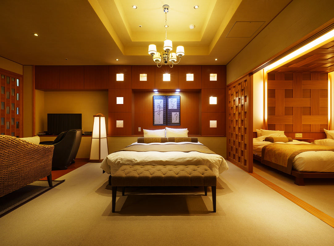 | 客室設備 | 液晶TV2台、冷蔵庫、湯沸しポット、金庫、コーヒーメーカー、オーディオ、ドライヤー、DVDプレイヤー、加湿器(冬季)、懐中電灯、 絆創膏、ソーイングセット、ホチキス、つめきり、室内電話、インターネット有線接続&無線Wifi接続、マッサージチェア、 酸素クラスター除菌脱臭装置、リファカラットレイ、リファファインバブルピュア、リファビューテックドライヤープロ、カールアイロン、ストレートアイロン |